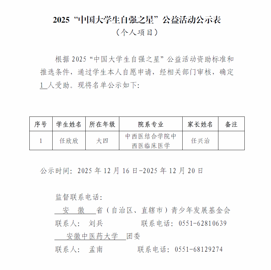 2025“中国大学生自强之星”公益活动推荐名单公示