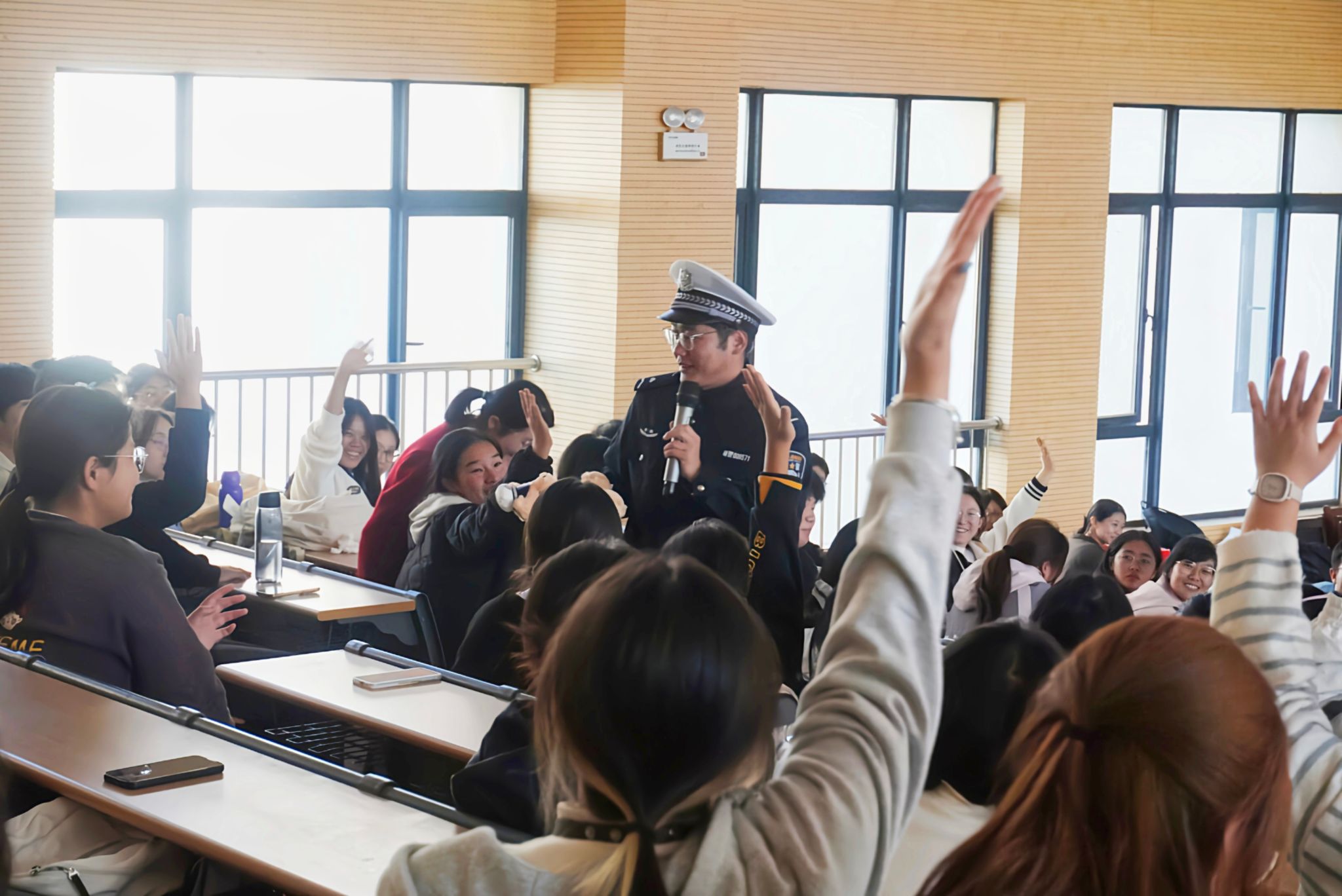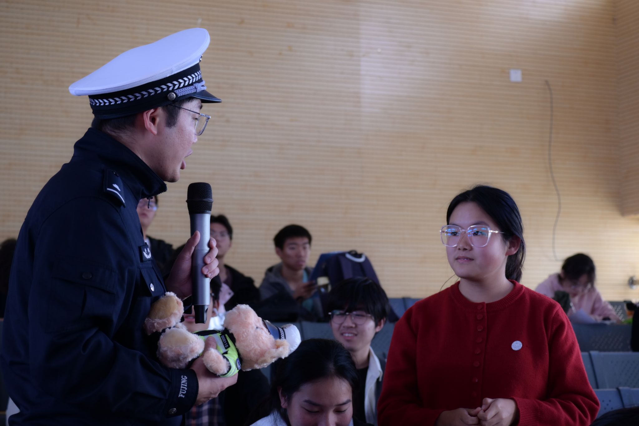 活动现场,交警新站大队陶静枝警官采用“案例讲解+法规解读”的形式,结合秋冬季道路出行特点与学生高频交通场景,重点讲解了“一盔一带”、酒驾醉驾危害、行人斑马线礼让及非机动车规范骑行等安全知识,为200余名师生送上了一堂“有温度、有实效”的交通安全课。现场还设有知识问答等趣味互动环节,在一问一答中,学生进一步加深对所学知识的理解,现场掌声、笑声不断,安全知识入脑更入心。