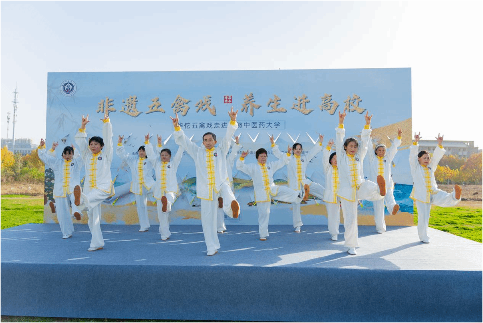 亳州市华佗五禽戏协会五禽戏传承人团队带来了刚柔并济的功法表演,舒展的动作将虎、鹿、熊、猿、鸟的神韵融入养生招式,赢得现场师生阵阵掌声。