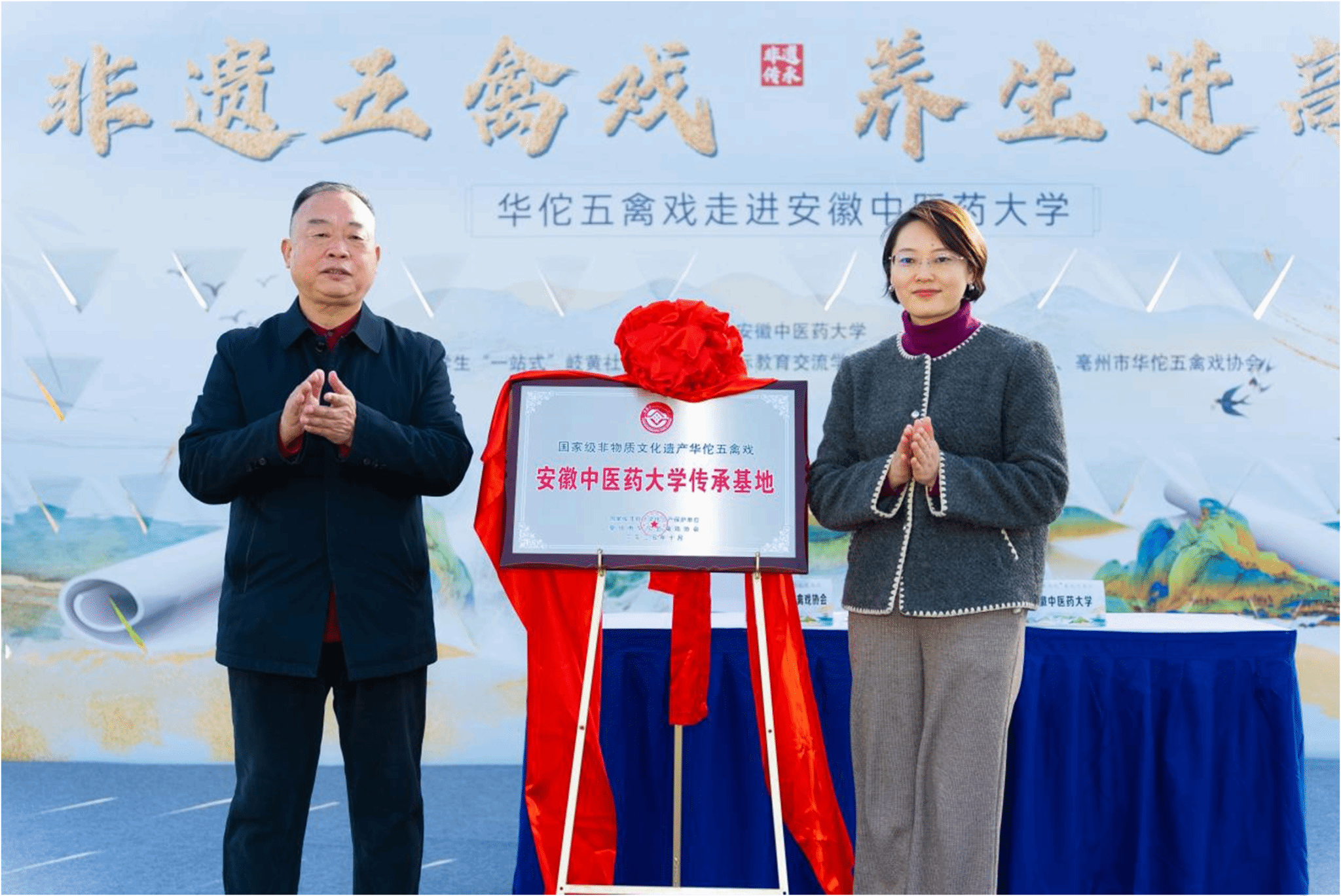 现场双方共同签署了《国家级非物质文化遗产华佗五禽戏安徽中医药大学传承基地合作协议》,并为“华佗五禽戏传承基地”揭牌。