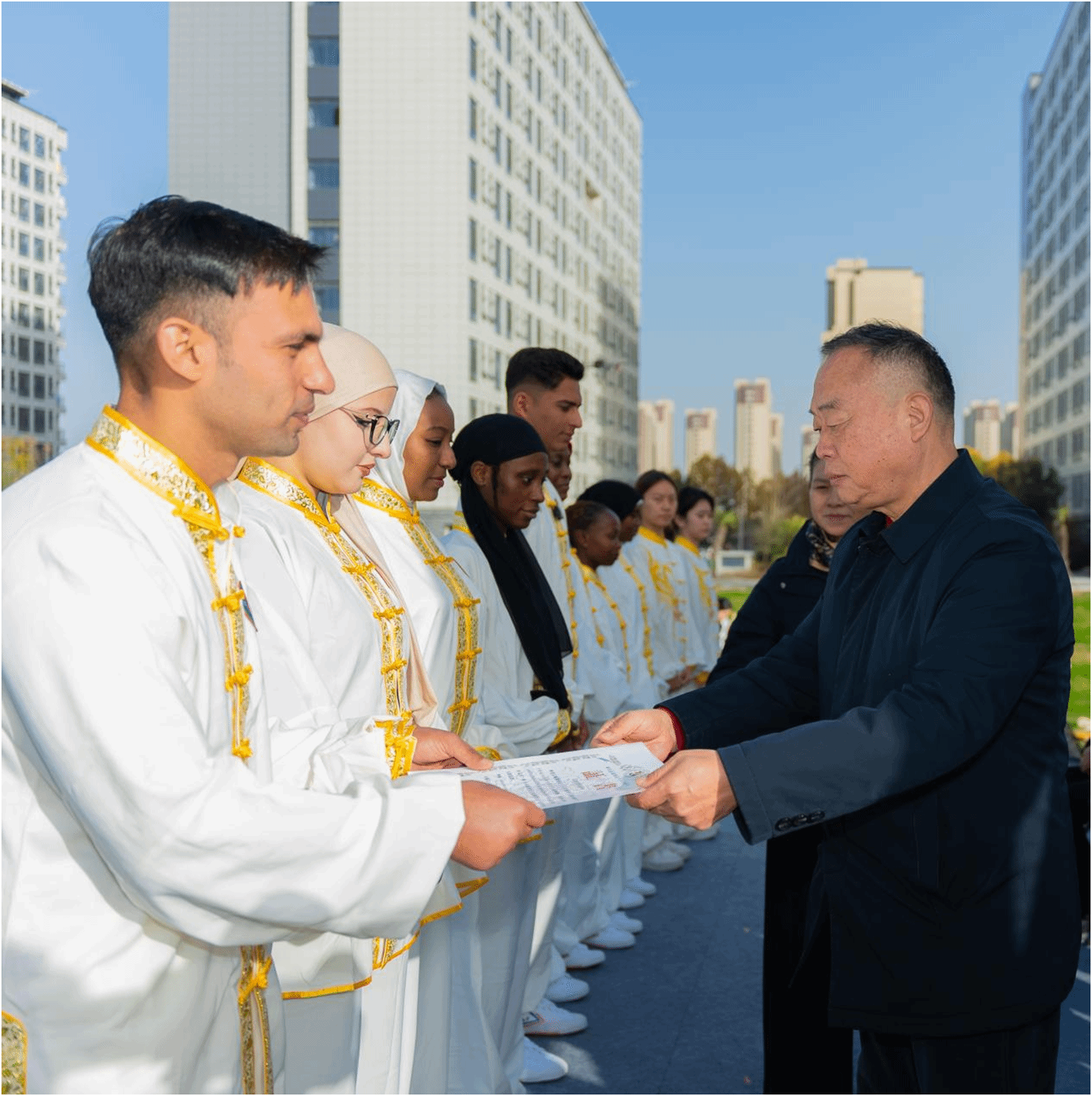 在拜师仪式环节,来自14个国家的35名弟子分三批向周金钟行拜师礼、呈拜师帖,周金钟为弟子们颁发证书。“这是传统技艺走向青年、走向世界的新起点。”周金钟表示,五禽戏承载着中医养生智慧,期待在高校培育更多年轻传承人。来自体育健康学院的教师彭小雷、巴基斯坦留学生泽一以及多次在全国大学生跆拳道锦标赛中获奖的潘依慧向师父行敬茶礼。