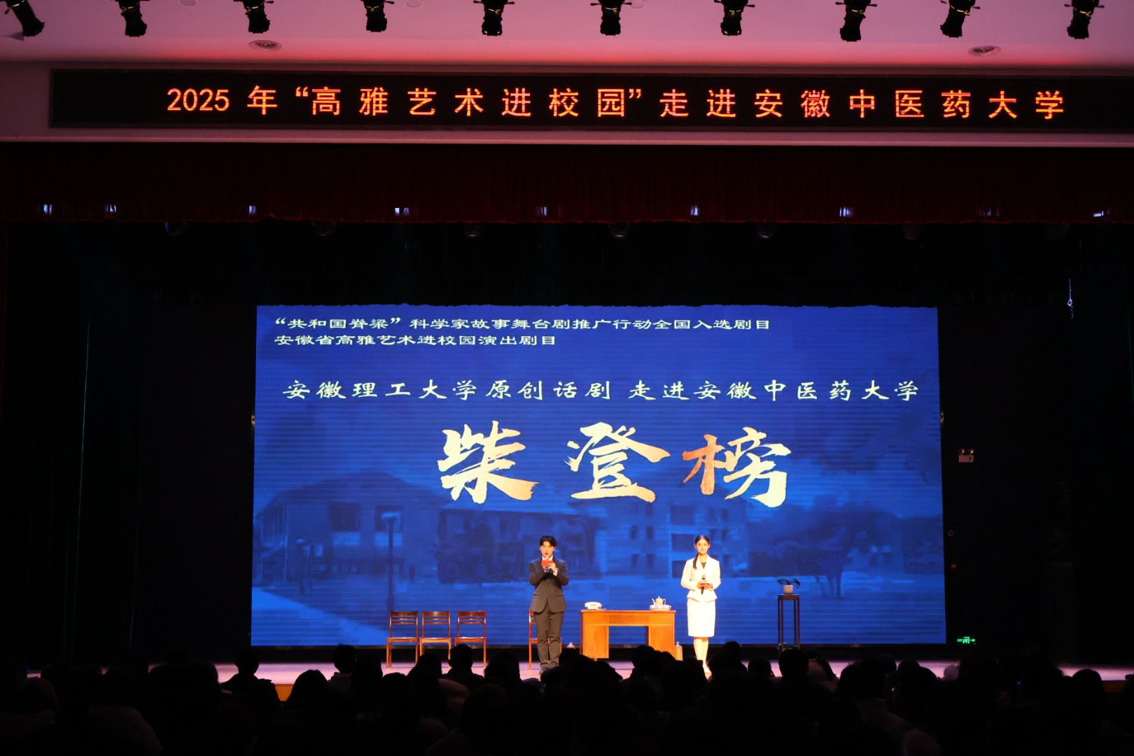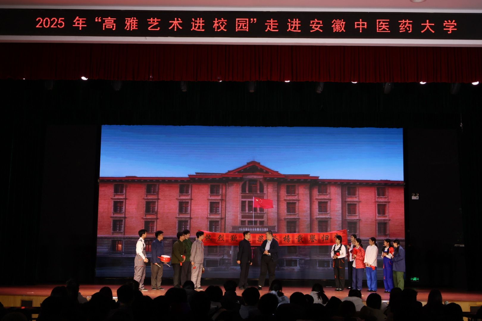 12月12日,由安徽省教育厅主办、安徽理工大学承办的2025年“高雅艺术进校园”专场演出在我校精彩上演。安徽理工大学师生编排的原创话剧《柴登榜》登上舞台,吸引了数百名师生到场观看。