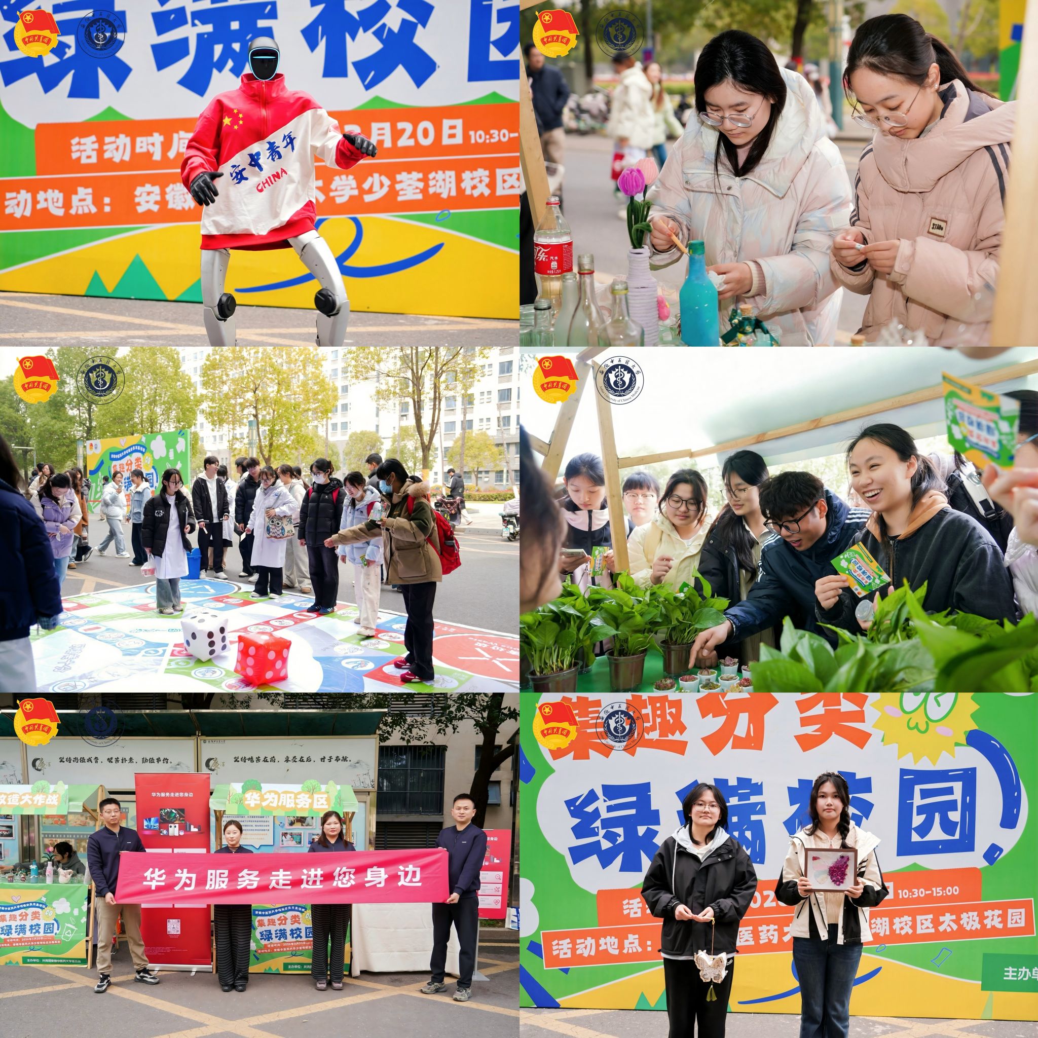 活动现场设置了六大特色区域,亮点纷呈,每一处都成为同学们解锁环保知识、践行绿色理念的“打卡点”。春晚同款智能机器人化身“垃圾分类科普官”,现场生动科普垃圾分类知识并与同学们开展互动问答;空瓶回收与环保手作市集,让同学们亲手将废旧物品打造成创意手作;垃圾回收飞行棋则以趣味游戏形式,帮助大家巩固分类知识。此外,咖啡补给站传递资源再生理念,华为服务站提供免费贴膜、设备保养等便民服务,同学们参与活动收集印章,可兑换绿色植物、校园文创等精美礼品。