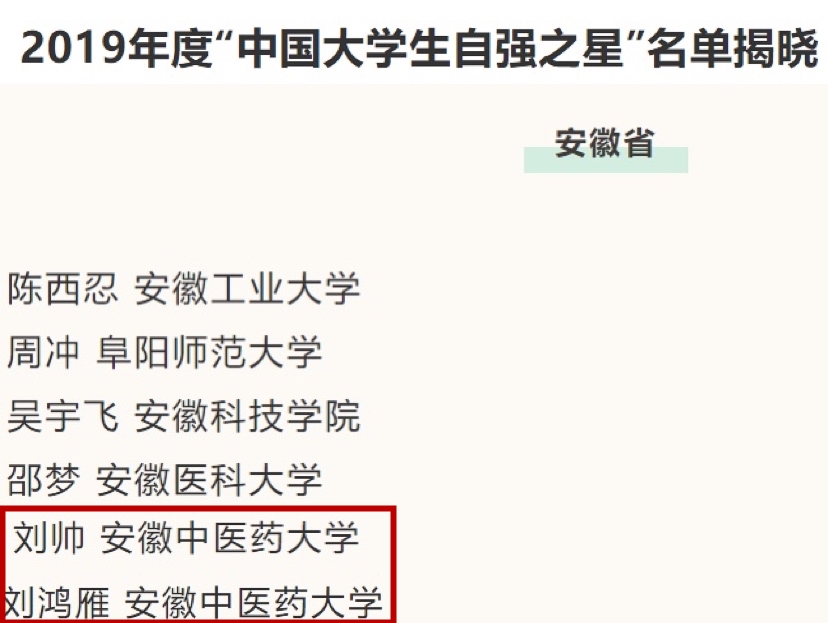 2019年度“中国大学生自强之星”奖学金公示名单日前发布。我校推荐的护理学院刘鸿雁、药学院刘帅两名同学入选公示名单。