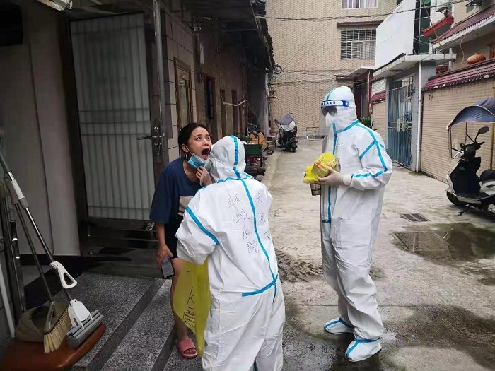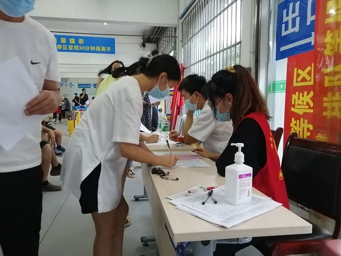 “每次检测有六百到七百人,工作量巨大,”杜梓楠介绍到,“我和同行的志愿者们甚至要工作到凌晨两点,工作完成才会安心回家。”有时候一些居民因个人疾病等原因需要入户检测,这时,他们需要顶着酷热的天气,穿着闷热的防护服,但还得带着细心热心的态度上门进行核酸检测。