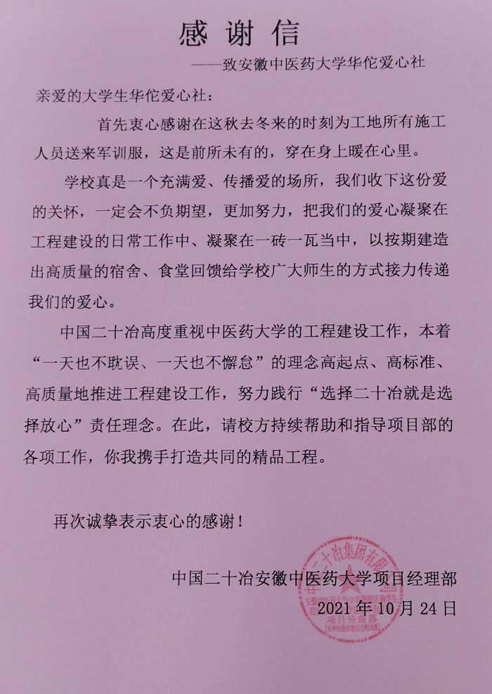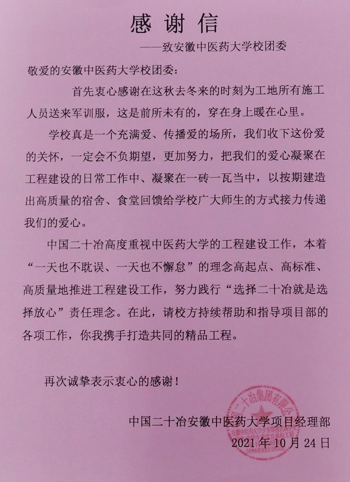 11月2日下午,中国二十冶安徽中医药大学项目经理部办公室主任王明德、安工部部长张满兴等联系我校,对我校团委开展的“军训服捐赠志愿服务活动”表示感谢,并赠予感谢信。