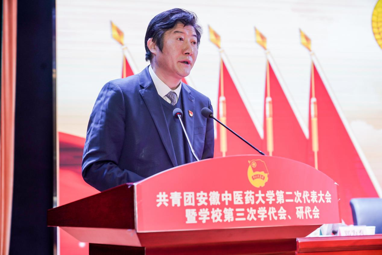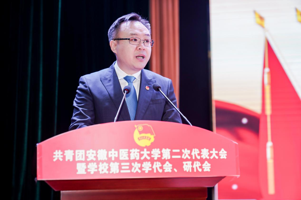 李波代表共青团安徽省委、安徽省学生联合会向大会的胜利召开表示热烈的祝贺,向全校广大团员青年致以诚挚的问候和良好的祝愿,并充分肯定近年来学校各级团学组织取得的显著成绩。他指出,一要坚定理想信念,牢牢把握政治引领,深入学习习近平总书记“七一”重要讲话精神、党的十九届六中全会精神、安徽省第十一次党代会精神,让青年学生在学思践悟中坚定理想信念,在奋发有为中践行初心使命;二要矢志艰苦奋斗,竭诚服务同学成长,将团学全部工作自觉纳入学校工作大局,不断提高服务能力,进一步增强主人翁意识,牢记团学组织职责,深入推进实践育人,服务青年学生成长成才;三要深化改革创新,培育一流团学组织,围绕增强政治性、先进性、群众性,推进全面从严治团,着力推进组织创新和工作创新,努力探索富有时代特征、突出青年特点、体现学校特色的团学工作机制,有效增强共青团的引领力、组织力、服务力和大局贡献度。