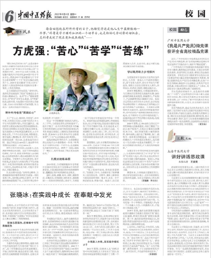 在方虎强的求学生涯里,“青年时代,选择吃苦也就选择了收获”是他成长奋斗的强大精神动力。他用“苦心”锻炼理想信念,用“苦学”夯实专业基础,用“苦练”收获过硬本领,为祖国的中医药事业贡献力量,为家乡的发展振兴贡献智慧,努力成为一名真正的铁杆中医药人。