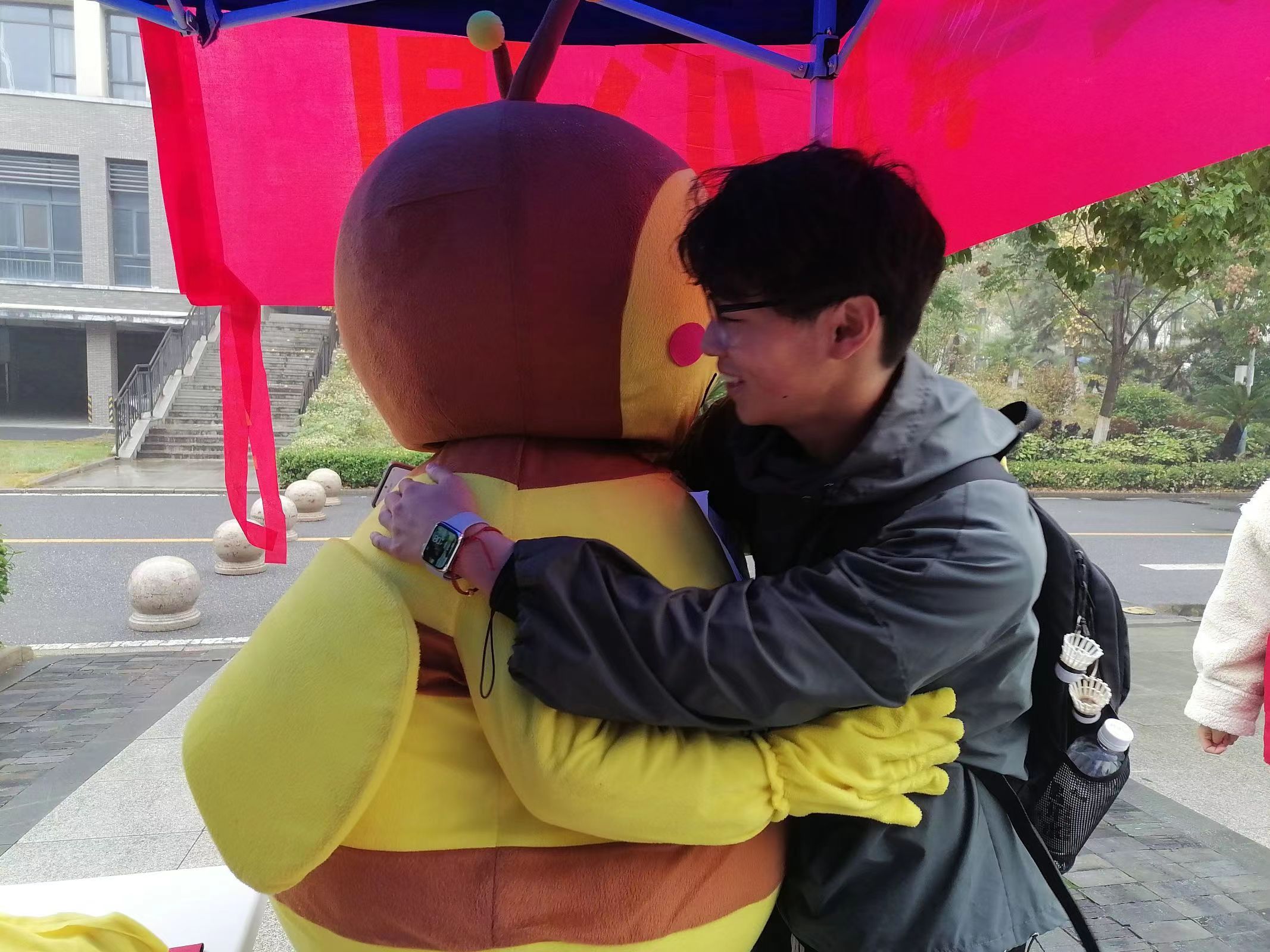 “艾”的抱抱,以爱于“艾”。防艾小蜜蜂上贴着“如果我是一名艾滋病患者,可以给我一个拥抱吗?”,师生们纷纷主动上前给予防艾小蜜蜂拥抱,爱在拥抱中流淌,爱在寒雨中散热。红会志愿者给拥抱防艾小蜜蜂的师生给予一条红丝带,红丝带象征着希望代表着支持,如纽带般将师生联系,共同对抗艾滋病。